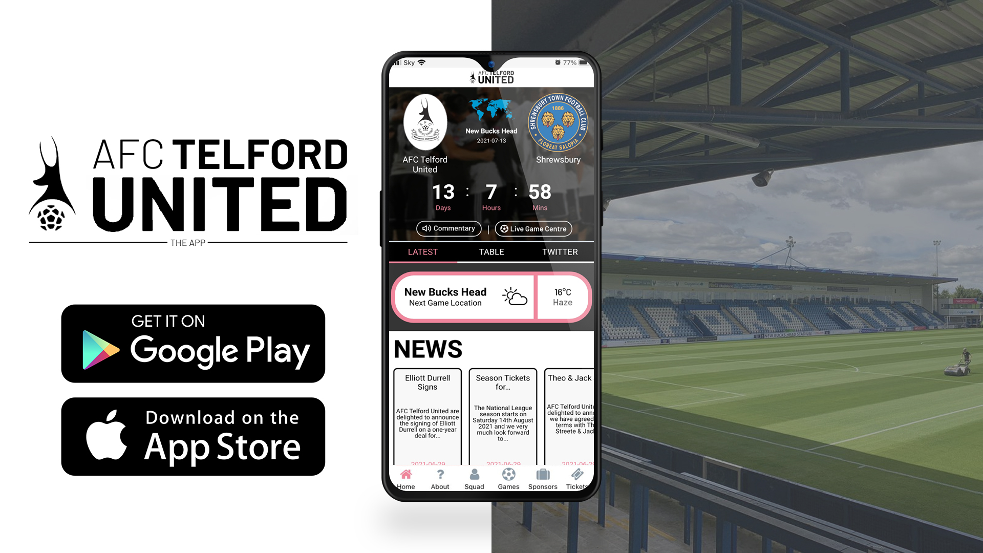 AFC Telford United are today delighted to announce the release of their official club mobile application, named ‘AFC Telford United – The App’, which is available now, free of charge, from both The App Store (for Apple) and Google Play (for Android).