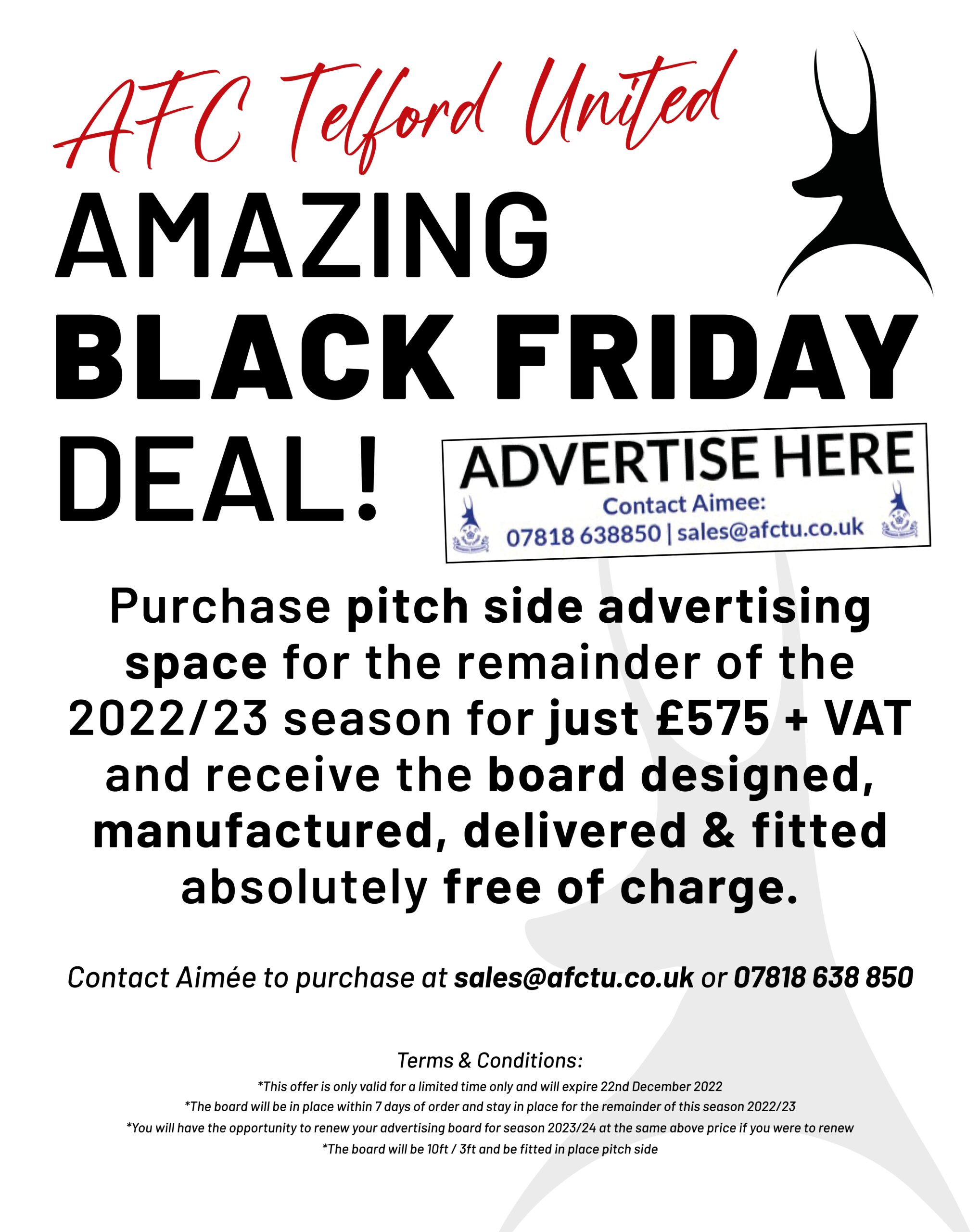 Purchase pitch side advertising space for the remainder of the 2022/23 season for £575.00 VAT and receive the board designed, manufactured, delivered and fitted absolutely free of charge.