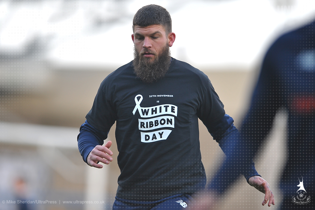 Many choose to wear a white ribbon to highlight that they have made the pledge and the Bucks are no exception. The players wore special T-shirts to show their support in the warm-ups for their recent home game with Southport at the New Buck’s Head.