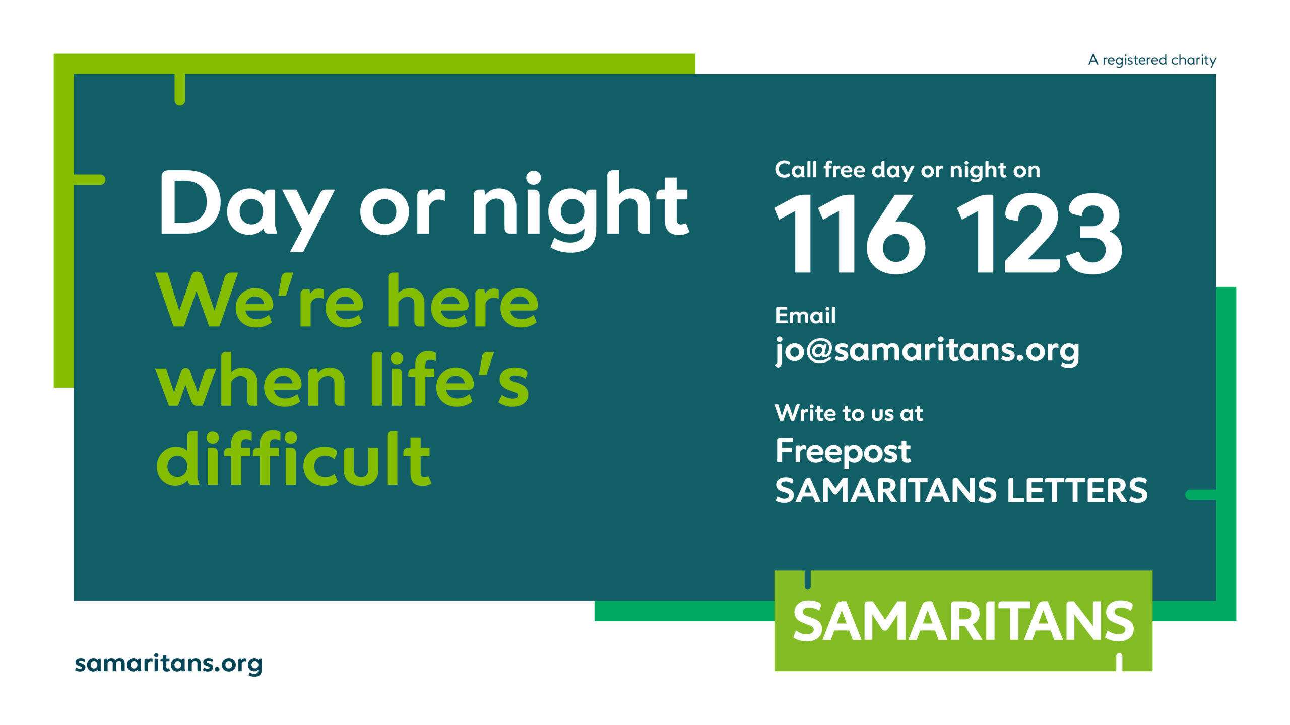 If talking to someone you know is too difficult, our charity partner Samaritans can help; their service is free, and available both day and night. Details of how to contact them are below also.