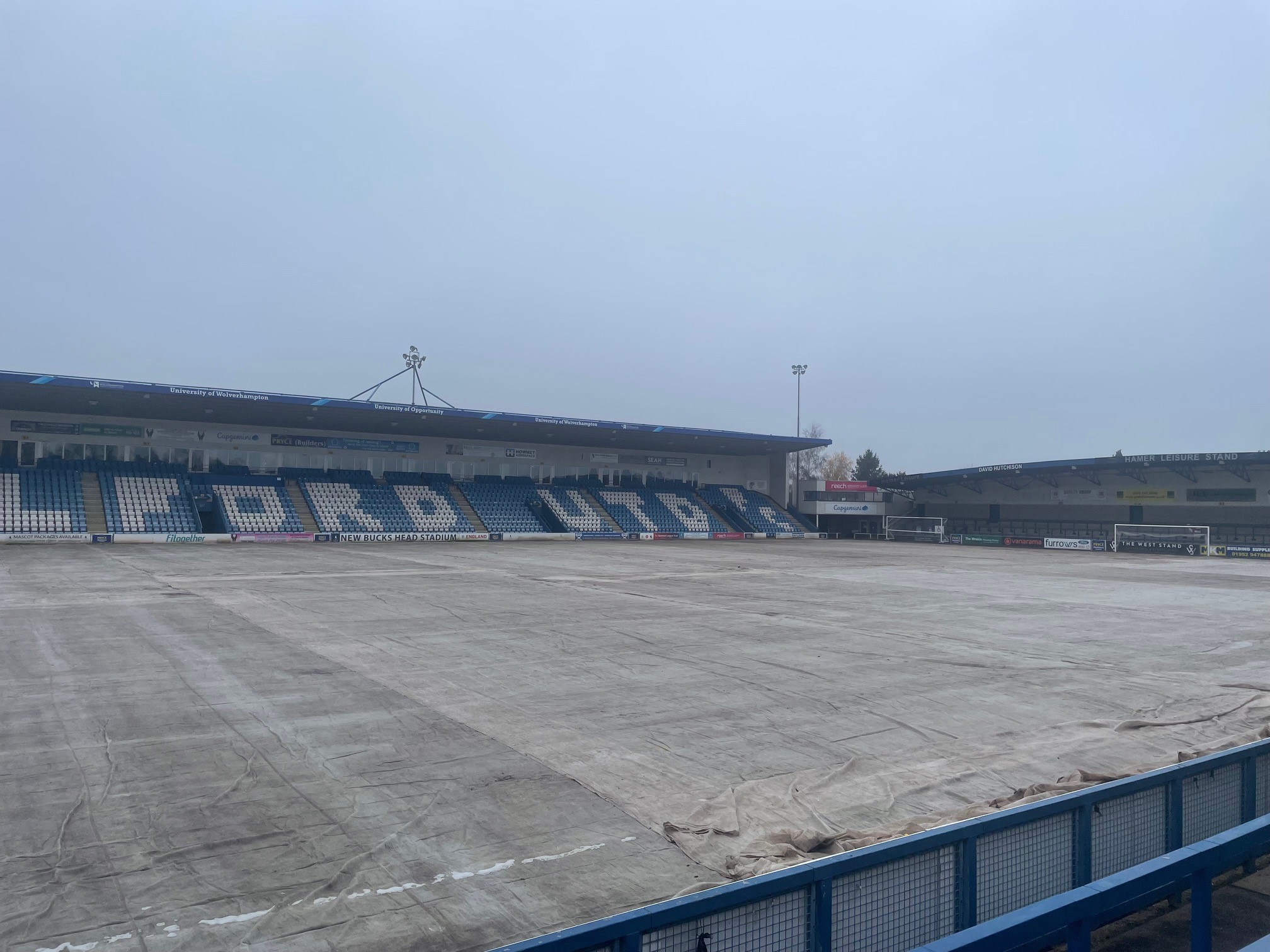 Covers have been in place on the New Bucks Head since last Wednesday evening. We will continue to monitor the condition of the pitch and weather forecast ahead of tomorrow night’s game against Kettering Town.