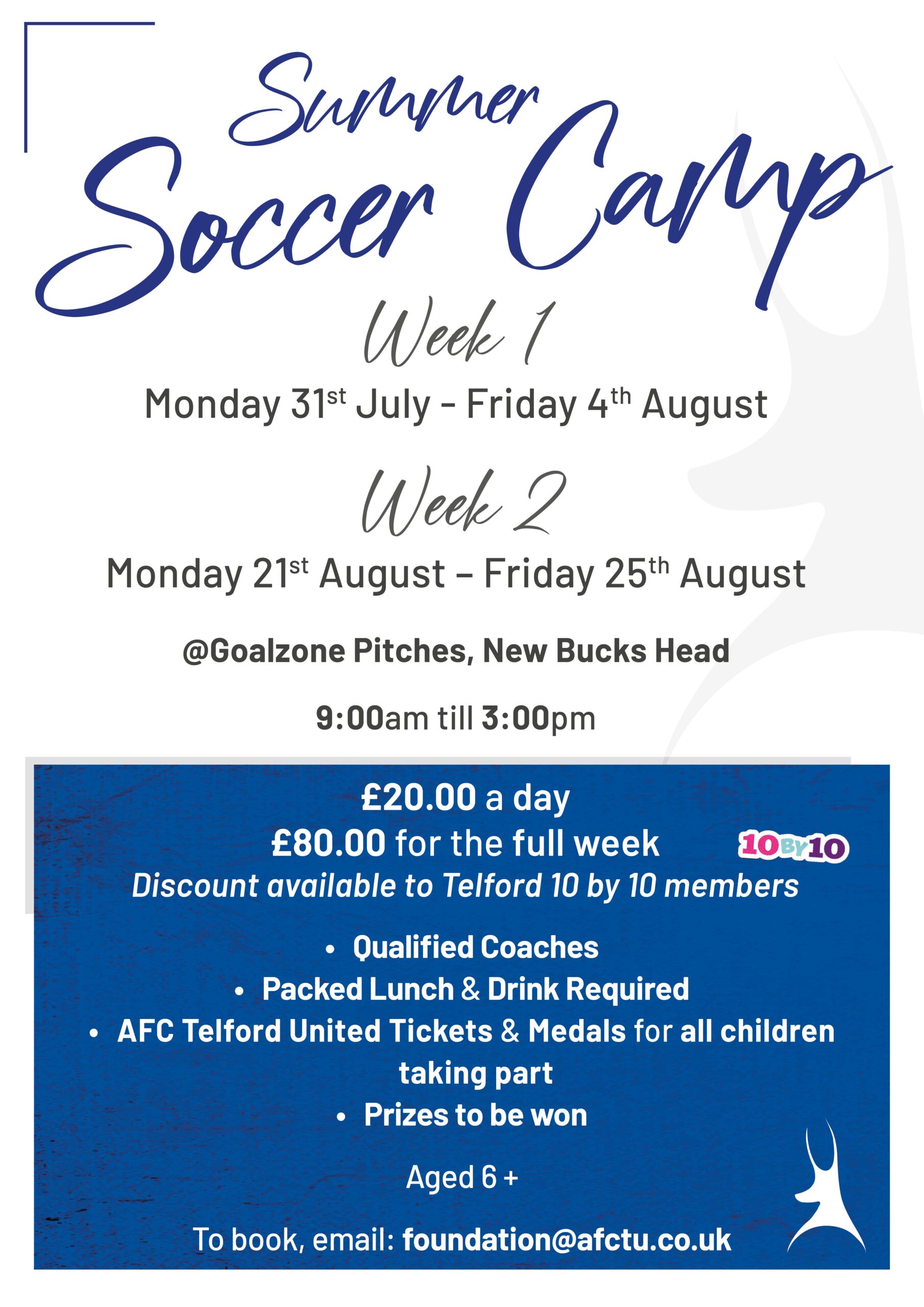 The soccer camp is open for children aged 6 to 12 years and is held on the Goalzone pitches at the New Bucks Head Stadium.